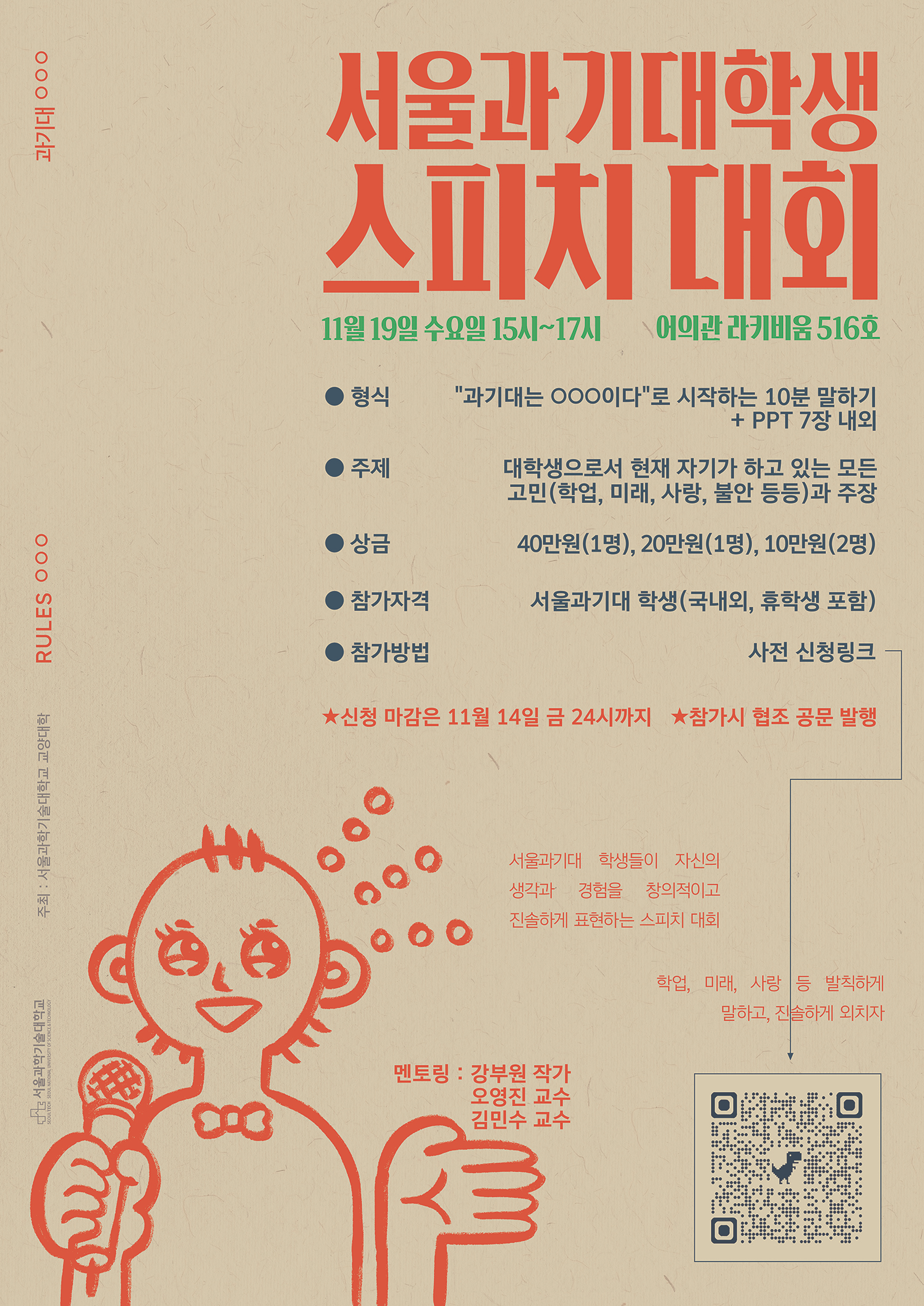 | 제목 | 제1회 서울과기대 스피치 증진대회 신청 안내 | ||||