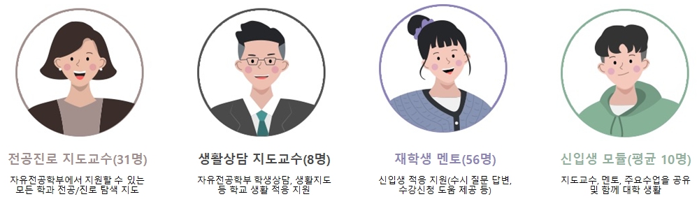 전공진로지도교수(31명) 와 생활상담지도교수(8명)가 전공/진로 탐색 및 학교 생활